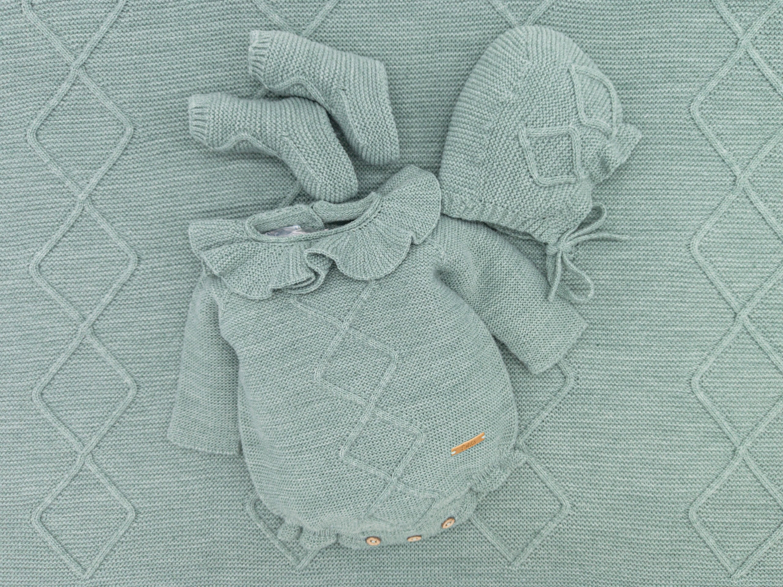 - Pelele: El pelele es la pieza central del conjunto, asegurando confort y libertad de movimiento con su tejido cálido y suave. Perfecto para mantener el cuerpo del bebé cubierto sin limitar sus movimientos, lo que lo convierte en una prenda ideal para el día a día y para ocasiones especiales.